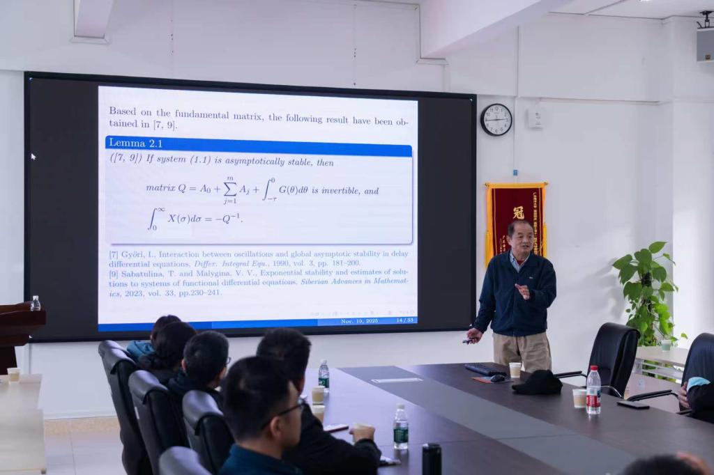 胡广大教授聚焦分布时滞线性系统的稳定性判据问题,围绕分布时滞模型的建立、稳定性分析方法、典型判据与算例说明等方面进行了系统讲解。介绍了分布时滞在实际工程与控制系统建模中的典型来源,分析了系统在稳定性分析上的难点。胡教授结合基解矩阵等工具,给出了若干具有代表性的稳定性判别结果,并通过数值算例展示相关判据的适用范围和实际效果,为从事控制论与动力系统研究的教师提供了有益参考。